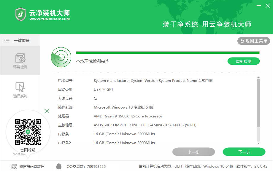 1.系统检测,下载软件完软件后正常打开("云净装机大师"), 程序会默认检测当前系统环境,检测完成后,点击"下一步"。